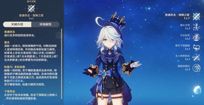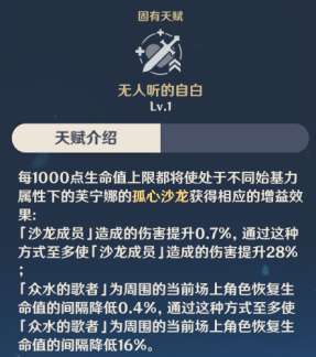 芙宁娜的天赋中只有增加伤害的属性,她自身的攻击伤害非常低,即使天赋加成后也不明显改善,同时,回复能力间隔时间也不实用,完全没有必要努力达到满值。此外,芙宁娜的天赋给出的数值也非常低,让人很不满意。