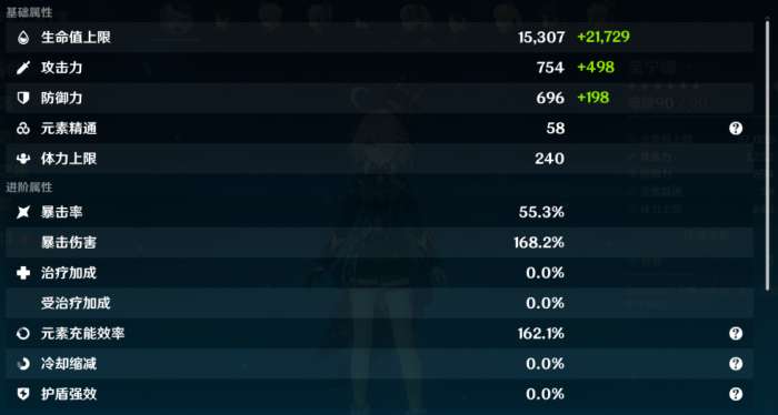 双爆55.3%+16% /71%:168%(暴击率很重要我爆伤歪的有点多);充能162%勉强够(最好堆到170%+)