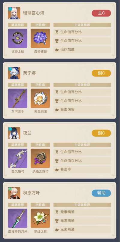 如果没有万叶或夜兰,就可以选择以行秋替代,但是替换后的伤害会显著降低。如果不能凑齐这四个人物,我建议各自走自己的路。