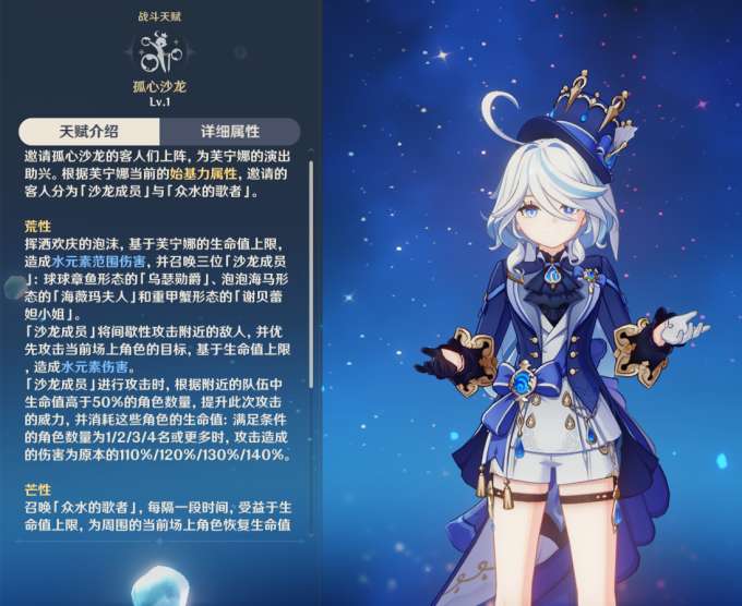 纯后台角色,但具备高频水属性伤害输出和不俗的对单挂水效率。可以切换到治疗形态,并且永不断档的大招和战技。可以产球来补给前台的水系角色,并提供高额的全队增伤效果。一个简便而廉价的芒荒工具人,不需要依赖专武,且命座提升效果巨大。有最契合的圣遗物套装,能够在枫丹大世界游玩时提供不错的体验。机制迎合了枫丹全体角色,是各种烧血C重要的拼图之一。具有良好的泛用性,可以适配多样化的配队方式。在深渊螺旋专属环境中,输出效果尤为突出。我还提供了便捷的全自动战斗方式,未来还有可以期待的重要队友加入。特效华丽,动作优雅(优雅永远不会过时)。