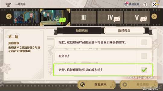 机位需求:客户与神秘卖家商讨。要求拍摄画面里要有客户里凯蒂,同时注意这里的神秘,因此拍摄画面里要有客户里凯蒂同时不能把卖家宵宫拍进去,对比之下也只有左边图符合要求。