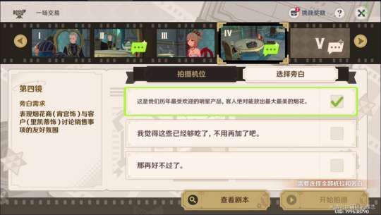 旁白需求:表现宵宫和里凯蒂讨论销售事项的友好氛围。这里重点是讨论销售问题,所以谈论的重点是烟花只有第一个合适。