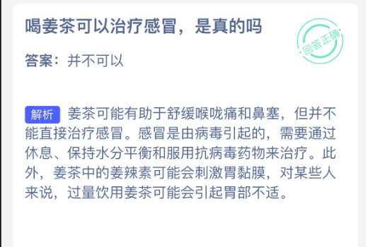 以上就是喝姜茶可以治疗感冒,是真的吗,支付宝蚂蚁庄园2025年10月13日答案最新,更多精彩内容,请点击关注pk游戏网更新!