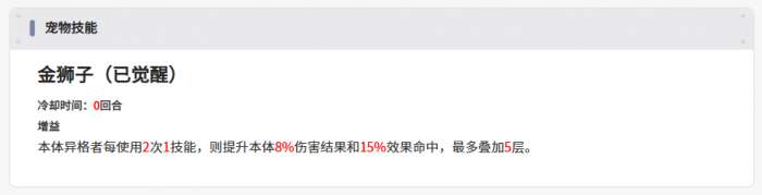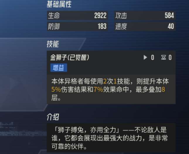 因为游戏当中即使是达到了四星的稀有度也不一定代表好用,但是这里的金狮子算是一个基础能力就比较高的攻击型智壳,它在整体能力上面是拥有一定的增益机制,使用了技能之后,它可以给本体带来一定的命中提升效果,这里的话会根据它的伤害结果来进行判定,因为命中效果也是有比例提升的,伤害结果越好的情况下,它带来的命中加成就越多,补增益能力也是可以叠加多层命中的,所以这个机制在搭配上,智壳自身有比较高的暴击数值的时候,就可以带来足够多的提升,那么金狮子在额外的优势上面还有一个自带的追击技能,所以战斗的时候,金狮子也是可以积累足够的增益,带来大幅度伤害的。