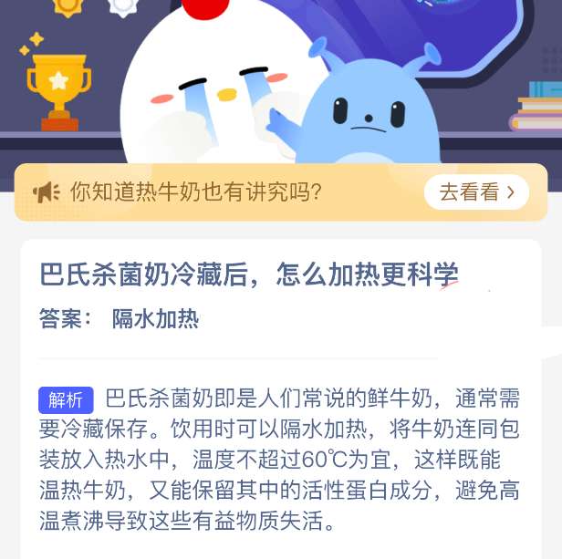 软件提交 专题合集 热门手游巴氏杀菌奶冷藏后,怎么加热更科学?支付宝小鸡课堂开课啦!每天只需花一分钟,动动手指答对问题,180g饲料立马到账!不仅自家小鸡吃得饱饱的,还能顺便捐个爱心,一举两得!2026年3月30日蚂蚁庄园的小鸡课堂题目正确答案是【隔水加热】,巴氏杀菌奶冷藏后,最科学的方式是隔水隔水温热加热。将牛奶倒入容器放进温热热水中缓慢升温,避免明火直煮、微波炉高温快热,既能保留牛奶营养与原生口感,又不会因高温破坏蛋白质和活性物质,温和适口还更健康安全。