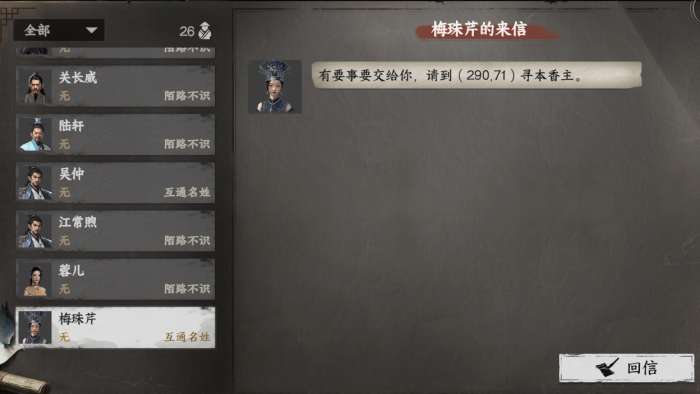做悬赏任务将门派好感提升到25时收到梅珠芹飞鸽