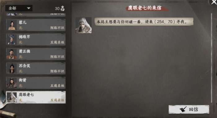 做悬赏任务将门派好感提升到100时收到鹰眼老七飞鸽
