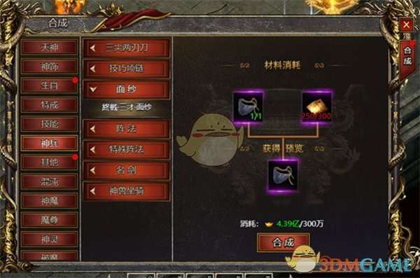 2、大家收集足够的面纱碎片后,可进入到合成系统里的神兵界面,消耗这些材料来合成初级面纱,或者提升身上佩戴的面纱等级,来获得更多的属性效果。
