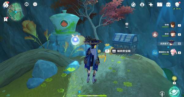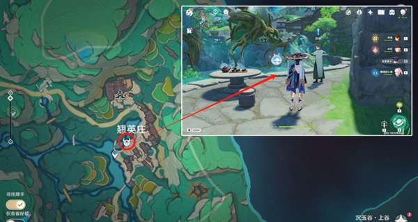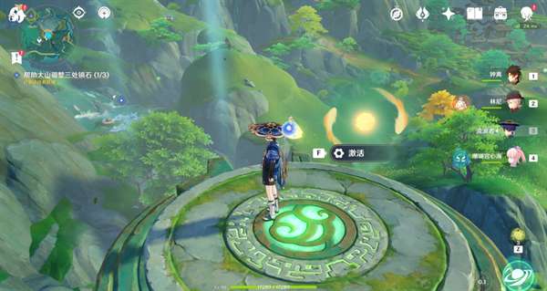 1.来到凉亭旁,与风属性机关互动,打开风场,凉亭上有一个苍灵鲤,利用风场到空中浮台
