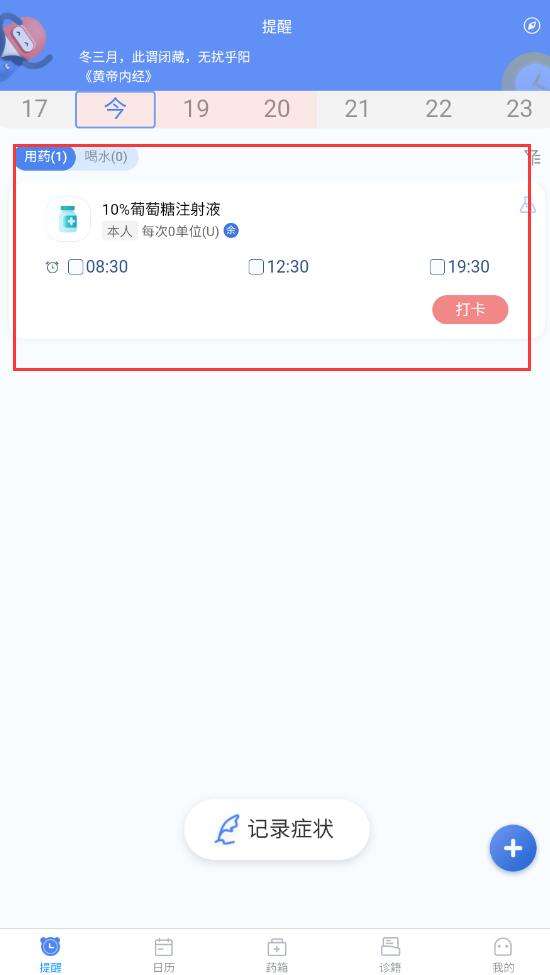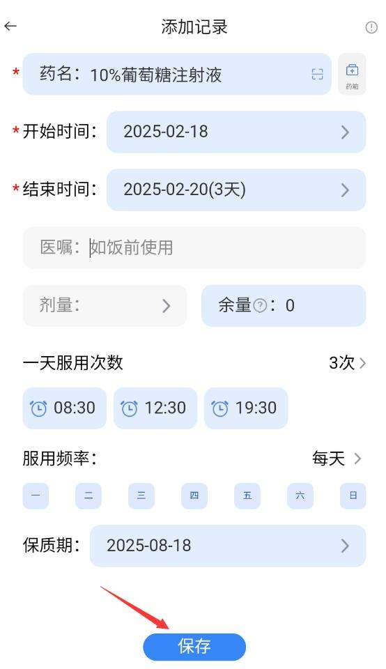 7、设置好需要用的药名,开始和结束时间,以及每天的用药时间等信息,点击保存