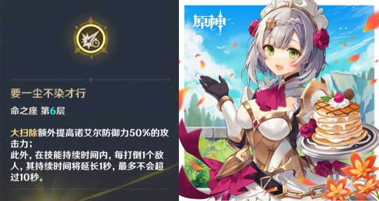 6命之前的诺艾尔,开启大招伤害也不高,并且持续时间短,难以担当主C重任。而6命诺艾尔,开大可额外获得防御值50%的攻击力,让女仆拥有站场主C的能力。并且6命诺艾尔开大每打倒1个角色,大招持续时间就延长1秒,最多10秒。6命诺艾尔真正解锁站场主C玩法,化身高达,诺艾尔真爱党必备。