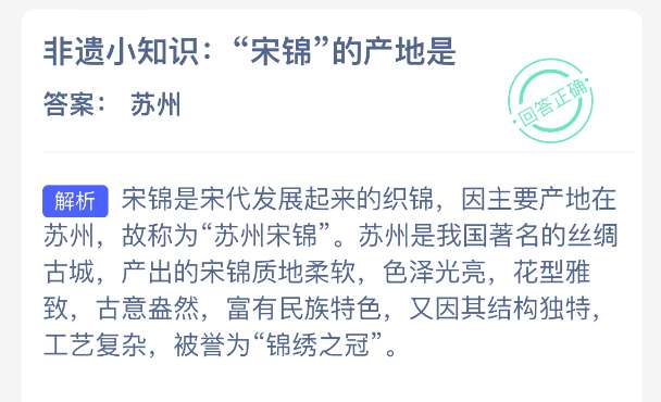 以上就是非遗小知识:“宋锦”的产地是?支付宝蚂蚁新村最新答案2025年12月27日,更多精彩内容,请点击关注pk游戏网更新!