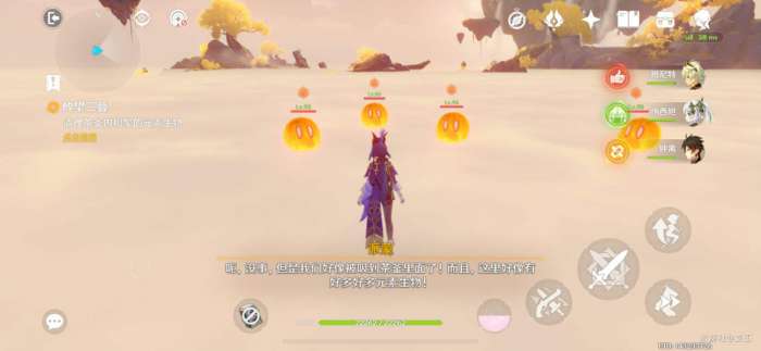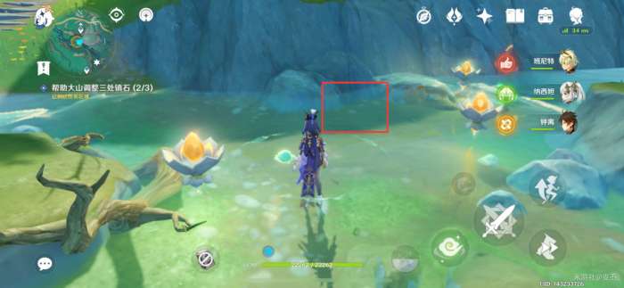 走到莲花灯,交互“调查”,出现水史莱姆,击败它们,出现流莲盏,等待移动到莲花灯位置