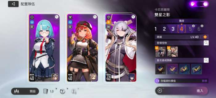 第三个组队阵容是专门为轰炸流玩家提供的,米卡+百丽儿+卡利佩,三个全攻可触发“秃鹫发射”,搭配2张伤害最高的“天鹰长剑”,再配合“重新集结”,可直接对银幕次数进行增加,每一轮“银色之幕”最少可触发一次攻击,玩家选择蓝色装备搭配就有机会拿到非常不错色分数,尤其是在清小怪的时候整体表现不错。