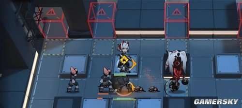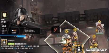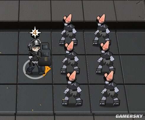 闪击的一技能“闪光护盾”是一种功能性强的控场型技能。当它被开启后,它可以让身前6格内的所有敌人陷入眩晕和沉默状态,持续时间为3.5至4.5秒。然而,为了控制技能的强度,每次部署后只能使用四次。在闪击头顶上会出现倒计数,以标识可使用此技能的次数。下面是实战演示图: