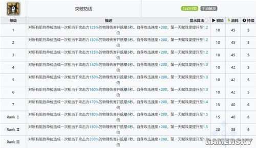 技能名称:突破防线 技能效果:对所有阻挡单位造成一次相当于攻击力170%/180%/190%/200%的物理伤害并眩晕6秒/7秒。使用后自身攻击速度增加200,第一天赋效果提升至1.4/1.5倍。