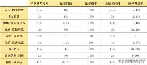 与其他地面干员相比,闪击所能造成的眩晕时间几乎是最长的,长达3.5秒至4.5秒,仅次于极其特殊的森蚺。在眩晕覆盖率方面,闪光的数据为16.28%,略高于专注于地面控制的狮蝎。虽然还不如森蚺和柏喙,但也是非常出色的。因此,总体而言,闪击的眩晕控制能力,无论是单次时长还是总覆盖率,都非常优秀。