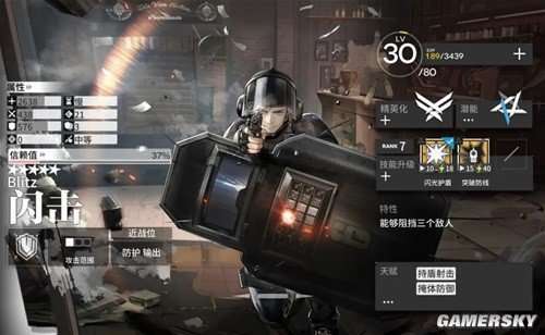 闪击的第二个天赋是“掩体防御”,和五星干员奶盾的天赋“门神”类似,两者的触发条件都很苛刻:需要周围地形的配合才能增强干员效果。奶盾的触发条件是必须站在高台上,而且身后必须有一位干员,而闪击的触发条件则是身侧或身后必须有高台,相对来说要宽松一些。