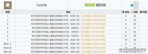 “闪光护盾”是一个能力,其作用是在前方特定范围内使所有敌人晕眩并失去特殊能力,持续时间为3.5/3.8/4.1/4.5秒;每次部署后可以发动4次技能。”
