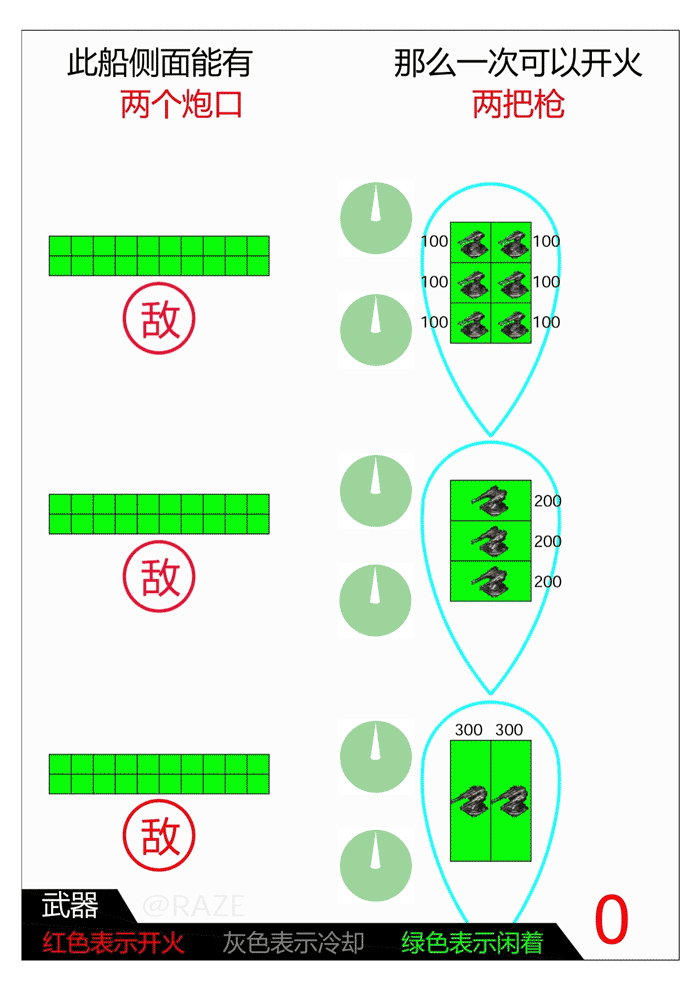 为了便于理解,可以把炮口想象为城墙上挖了一个小洞,后面一大群弓箭手人挤人,没法同时发射。只能轮流排队到小洞前射箭,再回到后方装弹。(但是这些弓箭手是自由的,在何处开火跟你把它装在船上的哪个格子没有关系。有洞他就会自己钻过来射)