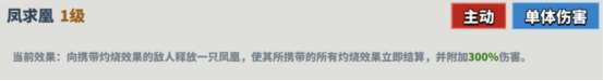 描述:向携带灼烧效果的敌人释放一只凤凰,使其所携带的所有灼烧效果立即结算,并附加300%伤害。