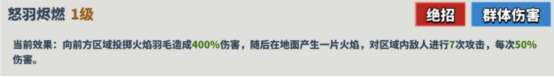 描述:向前方区域投掷火焰羽毛造成400%伤害,随后在地面产生一片火焰,对区域内敌人进行7次攻击,每次50%。
