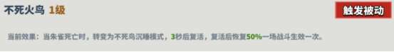 描述:当朱雀死亡时,转变为不死鸟沉睡模式,3秒后复活,复活后恢复50%,一场战斗生效一次。
