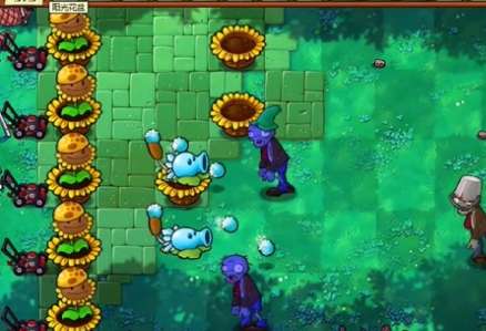 2、先在最左侧种植一列向日葵花盆和阳光向日葵,在中间种植两个寒冰香蒲。