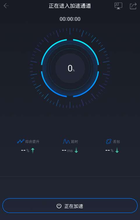 3、奇游手机游戏加速器加速完成后,我们可以点击中央按钮开始游戏,从而享受更稳定的网络服务。