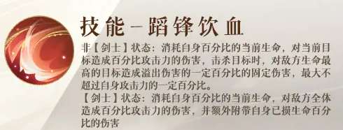 说到技能,凌统的【蹈锋饮血】更是将他的战斗风格发挥到了极致。在非【剑士】状态下,凌统会以当前生命为代价,打出强大的攻击力伤害。这个技能最吸引人的地方在于击杀敌人后,还能将伤害溢出到敌方生命最高的目标上,给敌人致命一击。溢出的伤害虽然有限制,但当你一击击杀一名敌人,顺带给敌方最强的那一位补上一刀,这种“横扫千军”的感觉真是爽到爆。而如果他处于【剑士】状态,技能的威力则更上一层楼。不再是单一的攻击,而是全体敌人都得面对凌统的怒火,额外附带的生命损伤简直让敌人无法承受。