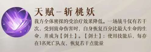说到天赋,凌统的【斩桃妖】简直是让人眼前一亮的存在。全体密探的受治疗效果降低是个非常有趣的设定,让敌人很难通过治疗手段来扭转局势。最令人惊喜的是,凌统在面临致命伤害时,可以恢复自身最大生命的百分比,并转变为【剑士】状态。这种技能的设计巧妙地弥补了凌统在关键时刻可能遇到的生存问题,并且让他在阵亡队友的数量越多时,恢复的能量越多。这意味着他可以更频繁地使用技能,带领团队走向胜利。