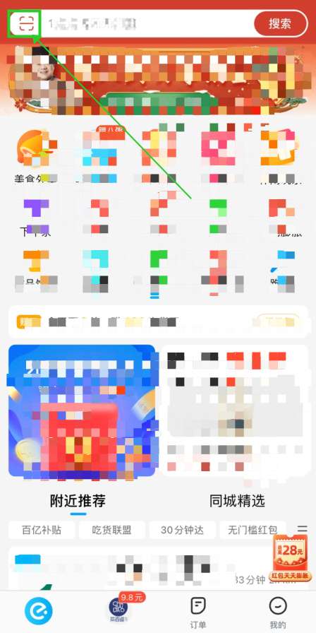 2、找不到扫一扫位置的,在饿了么APP首页搜索栏旁就可以看到,如下图: