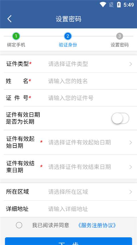 4、输入姓名、身份证、有效日期、详细地址,点击下一步;