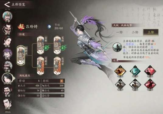 第一位女将吕玲绮,在游戏当中它主要以爆发技能为主,在短时间内可打出成吨伤害,整体的战法衔接也非常流畅,比较类似于夏侯渊,不过他在游戏当中以近战路线为主。角色在移动20次后还可以进行双次攻击,并对移动能力较低的地方可加成伤害。该角色比较推荐的技能是御风、奔袭和弧光掠影,御风和奔驰能够高效放大该角色的天赋,被动技能。而弧光掠影可以让该角色实现快速切进战场,与敌方完成战斗。