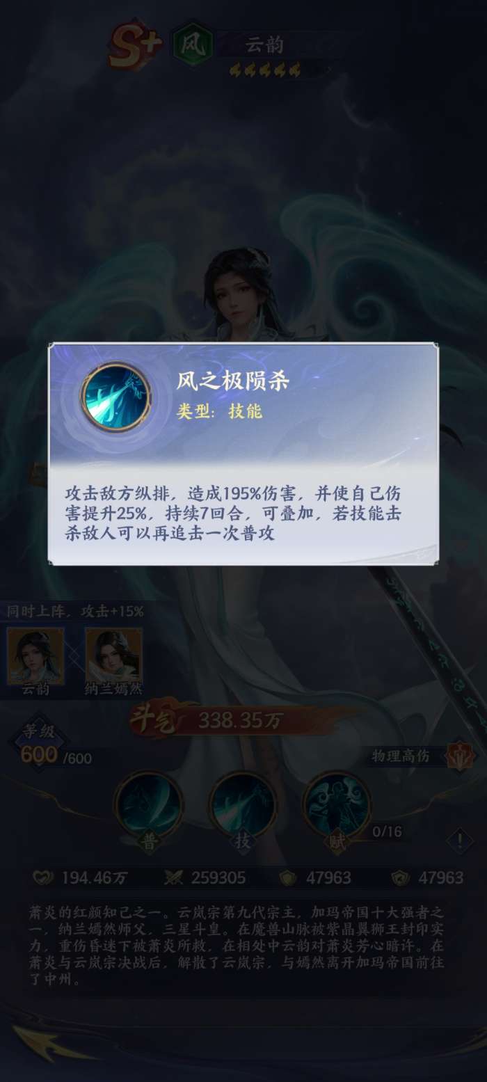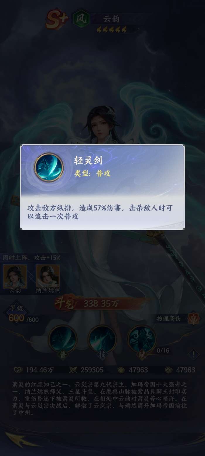 玩家需要注意的就是云韵跟纳兰嫣然作为师徒羁绊,她其实能够有效的输出,并且还可以进一步的补充输出,一旦在战斗的过程当中,将这对师徒一起上阵,那么云韵的实力也就会大幅度的上升,不过在搭配方面,建议相对灵活。