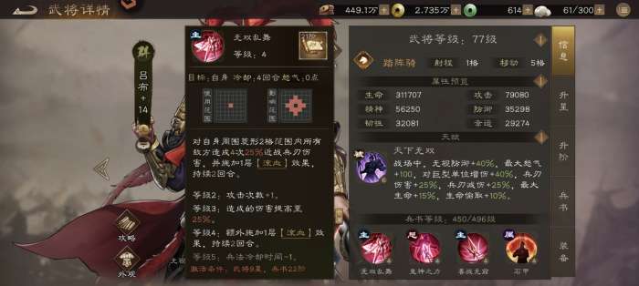 历史之魂:“无双”之名,源于其冠绝天下的个人武勇。高达40%的无视防御与各类伤害加成,正是其“辕门射戟”的精准与“勇力过人”的霸道体现,任何坚甲在他面前都形同虚设。高额的生命、减伤与吸血,则对应了其“三英战吕布”仍能全身而退的恐怖生存力与压迫感。他是一个能凭一己之力改写战局的“非人”存在。