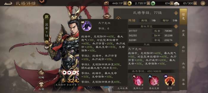 1星(入门):初始怒气+50,助其更快启动鬼神般的首次大招。