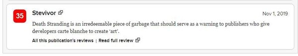 值得一提的是《死亡搁浅》MC媒体最低分为一家叫做Stevivor给出的35分,其评价更是相当直接地写道:“《死亡搁浅》就是一坨无可救药的垃圾,它应该作为那些给予开发商完全创作艺术自由的发行商的一个警告。”