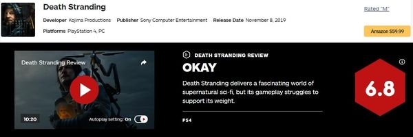在IGN的的点评中,其表示《死亡搁浅》带来了一个迷人的超自然科幻世界,但它的游戏性却难以支撑其重量。