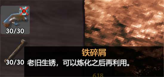 然后可以找到这种泥坑的废料堆,然后使用稿子来敲碎,就可以有一定的概率得到这个铁碎屑。可以熔炼成为铁,相当于就是铁矿了。