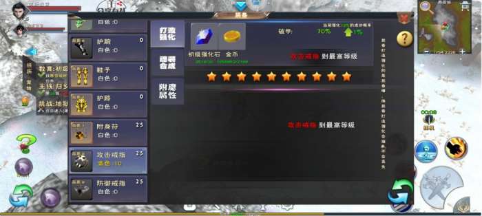 至于强化,优先把武器和攻击戒指都强化到极限先,剩余的可以强化防御戒指、衣服、护身符等。