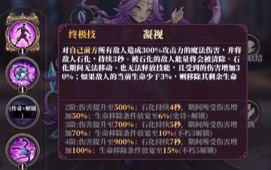 对前方所有敌人魔法伤害,满级石化持续7秒,非常bug,同时被清空能量且无法获取能量,受到伤害额外