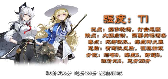 分析:奥古斯塔目前强度绝对的顶级,力大砖飞就完事了,但要注意的是日和月这两个角色要一起,才能发挥他们真正的强度,且复刻时间在3.0,如果不能一次性拿下的话不建议抽取。