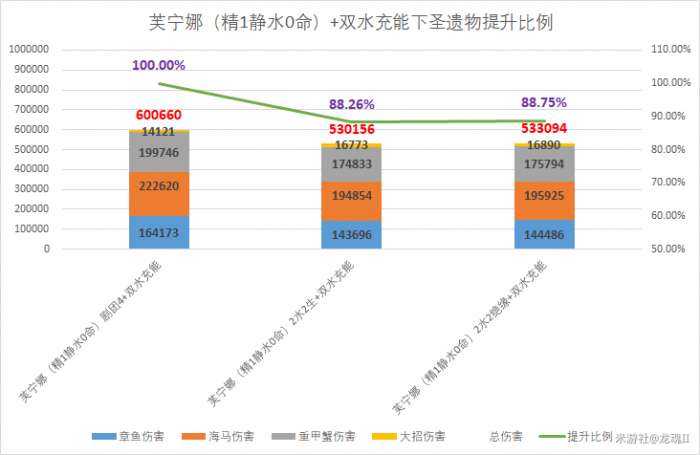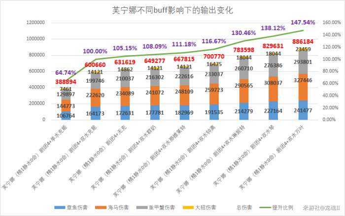 因为芙宁娜的属性情况变动很大,而单纯使用水属性的情况下,基本上不需要进行计算。因为在单水条件下,240%的充能输出仅有正常输出的60%左右。同时,也必须要携带充能沙漏和充能武器,才能实现这样的充能效果。因此,在这种单一条件下,没有进行对比的必要。 因此,在进行芙宁娜的对比计算时,我们选取了双水辅助充能的情况。同时,我们还分别计算了单人和万叶那维莱特出战的情况。最终,我们得出了如下的计算结果。