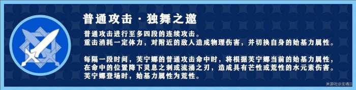 芙宁娜的普攻比较特殊,一共有4段单手剑普攻,但动作时长跟其他单手剑角色差不多。好处是4段普攻打完正好卡在2.5秒的CD重制上,可以打出3个反应计数。而且最后一段普攻几乎没有后摇,前两段动作时长也差不多。不同的是,第一套普攻的速度会比后续的普攻速度长一点点,因为拔剑有一点动作时长,后续则不用拔剑了。