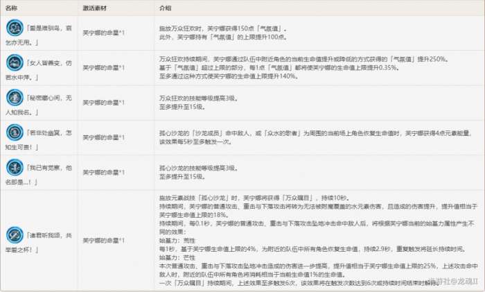7.命座对角色的提升非常显著。一命座可提高平均增伤并扩展队伍选择性,二命座不仅增强平均增伤,也提升个人输出表现。三命座可进一步增强平均输出效果,四命座则让充能得到完全释放。五命座则提升对动物的攻击效果。六命座是目前综合能力最强的,解锁了芒刀蒸发超级强力核爆和荒刀17秒内全队4000的超强回复。每个命座的效果都非常强大。