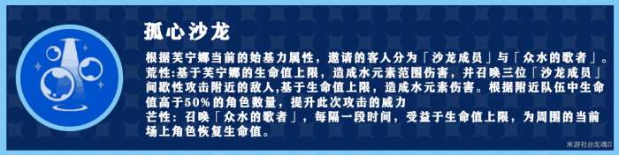 此外,天赋溢出奶量的回复效果不仅仅只是加强叠层,还有其他的作用。因为芙宁娜的E技能每秒掉血达到2.5%以上,对于一些单奶的阵容来说(例如班尼特),在奶量溢出的情况下,触发天赋就会实现1%芙宁娜生命值的全队回血。由于芙宁娜本身的血量通常是其他角色的2倍(只要不是那种以生命倍率为主的队伍,例如维莱特),所以即使有单奶在场,队友其实也不太会掉血。由此,利用这个溢出奶量的天赋,即使偶尔有单奶的情况,也能够完成循环。