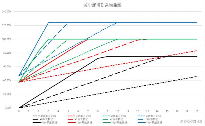 根据叠层机制,命芙宁娜的增伤提升能力有一定限制,单人入队时只能提升23%的增伤。但如果在队伍中有群奶或者枫丹角色,平均增伤可达到47%-56%,超过了万叶的提升效果。如果还有命座,1命就能让整个提升平均值上升37.5%,单人进入老系统也能保证60%的增伤提升,只要奶足够,可达到80%左右。2命则基本上可以在4秒内叠满,平均提升可达95%以上,3命则可直接提升到120%以上,相当于莫娜大招常驻两倍的效果。对于一些本身缺乏增伤的角色(比如夜兰),这个提升效果确实非常恐怖。