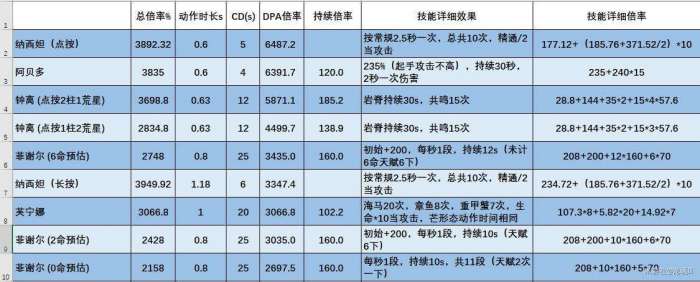 芙宁娜结合充能和叠层情况,实际队友实在是太多了,只能挑一些有代表性的,计算结果如下: