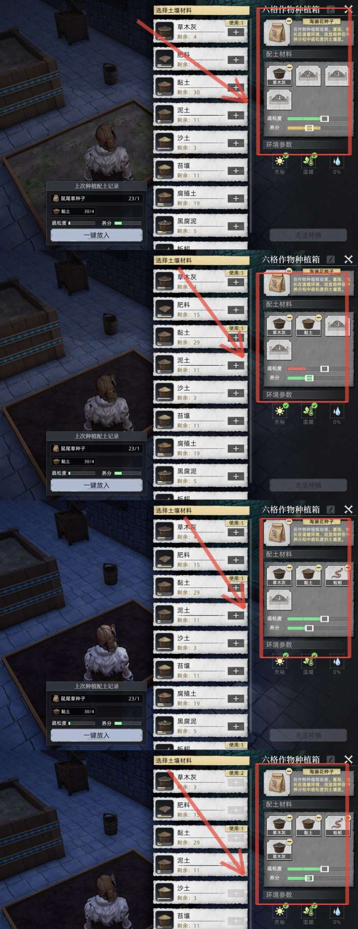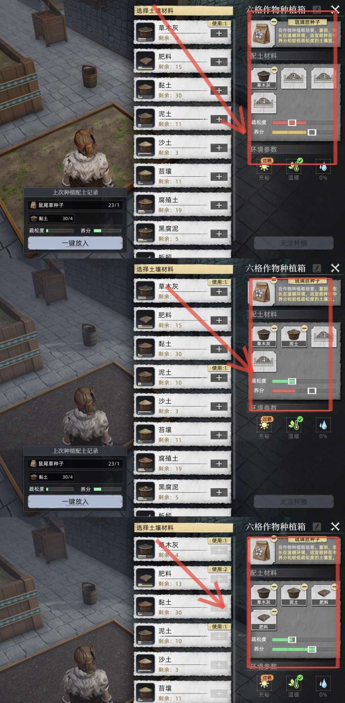 先放一个「草木灰」它的营养不够,疏松度高了。放 1 个「泥土」
